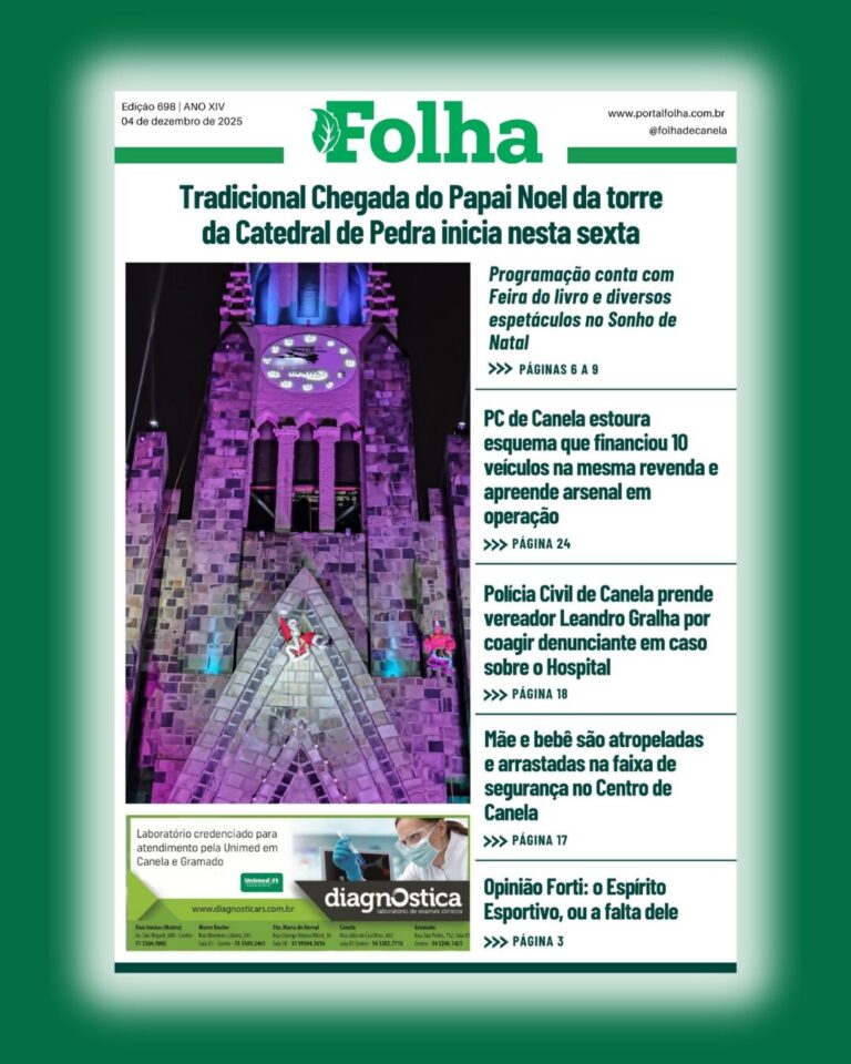 Folha de Canela – Edição 695 já está no ar!-13 de novembro de 2025 Destaques da semana: Sonho de Natal começa oficialmente em CanelaA abertura