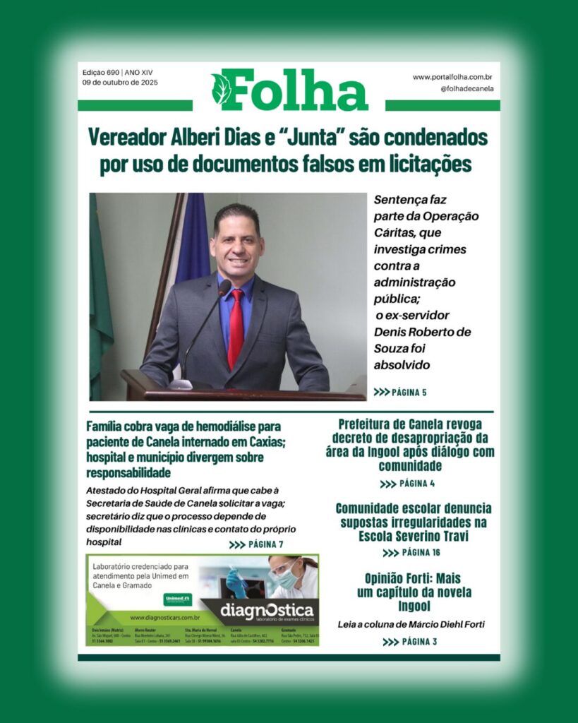 Destaques da semana: – Vereador Alberi Dias condenado — Alberi Dias e “Junta” são condenados por uso de documentos falsos em licitações. Sentença integra a Operação Cáritas, que investiga crimes contra a administração pública.– Saúde — Família cobra vaga de hemodiálise para paciente de Canela internado em Caxias; hospital e município divergem sobre responsabilidade.– Cidade […]