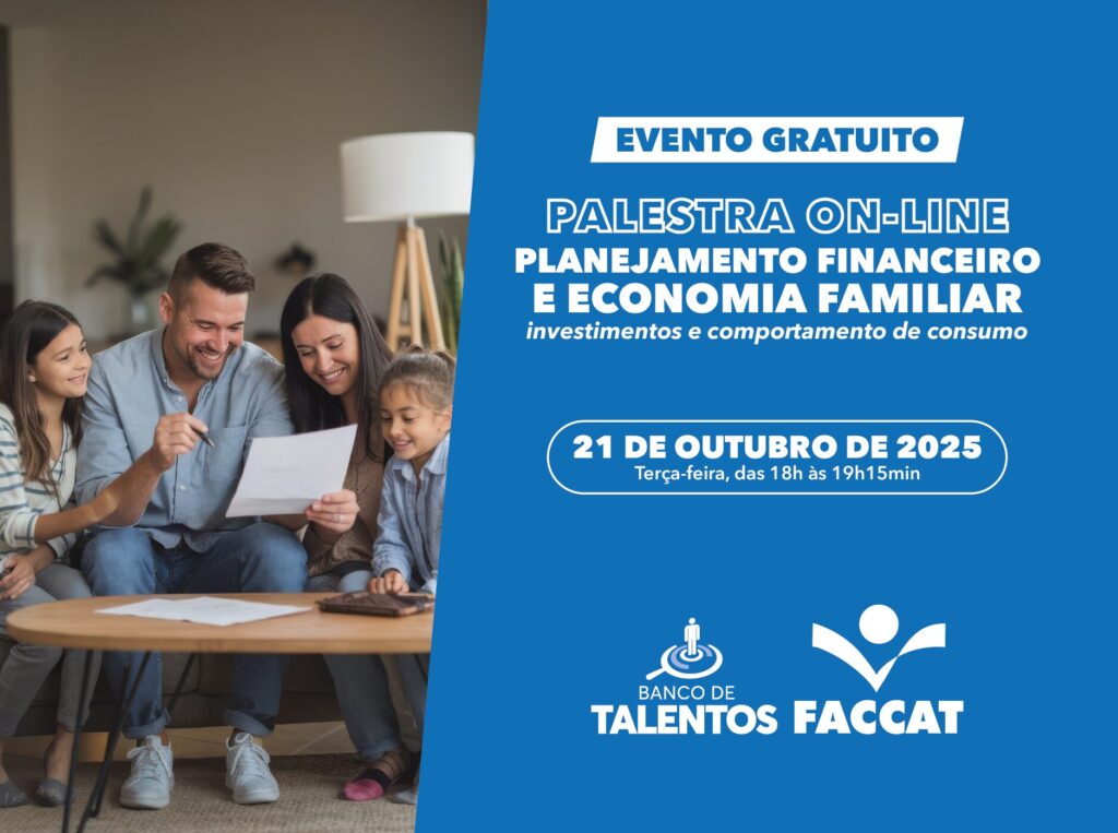 O Banco de Talentos das Faculdades Integradas de Taquara (Faccat) promove, no dia 21 de outubro de 2025, a palestra online “Planejamento Financeiro e Economia Familiar: investimentos e comportamento de consumo”, voltada a acadêmicos da Instituição e à comunidade em geral. O evento será realizado pela plataforma Google Meet, das 18h às 19h15min. Os interessados podem se inscrever até o dia 22 de outubro, por meio do site, www.faccat.br/cursoseeventos. A inscrição é gratuita.
