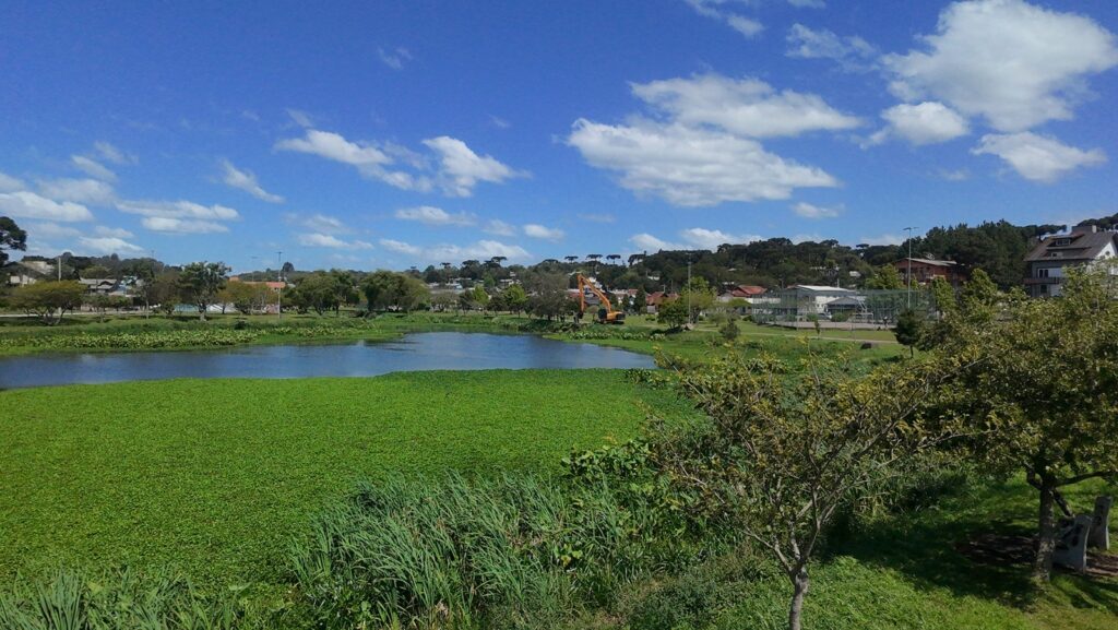 A Prefeitura de Canela deu início, na tarde desta segunda-feira (13), ao trabalho de limpeza da vegetação que se formou sobre o espelho d’água do Parque do Lago, localizado junto ao antigo Palace Hotel. A ação, determinada pelo prefeito Gilberto Cezar, é executada pela Secretaria de Meio Ambiente e Urbanismo e marca a primeira etapa de um amplo plano de revitalização do espaço.