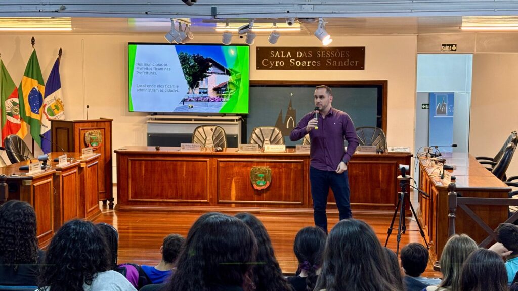 O presidente da Câmara de Vereadores de Canela, Felipe Caputo, recebeu nesta terça-feira, 14, os alunos do 7º ano da Escola Severino Travi para uma visita especial ao Legislativo Municipal, acompanhados das professoras Catiucia Deon e Elaine Idalgo. A atividade proporcionou aos estudantes a oportunidade de conhecer de perto o funcionamento da Câmara, o papel dos vereadores e a importância da participação política na construção da cidade.