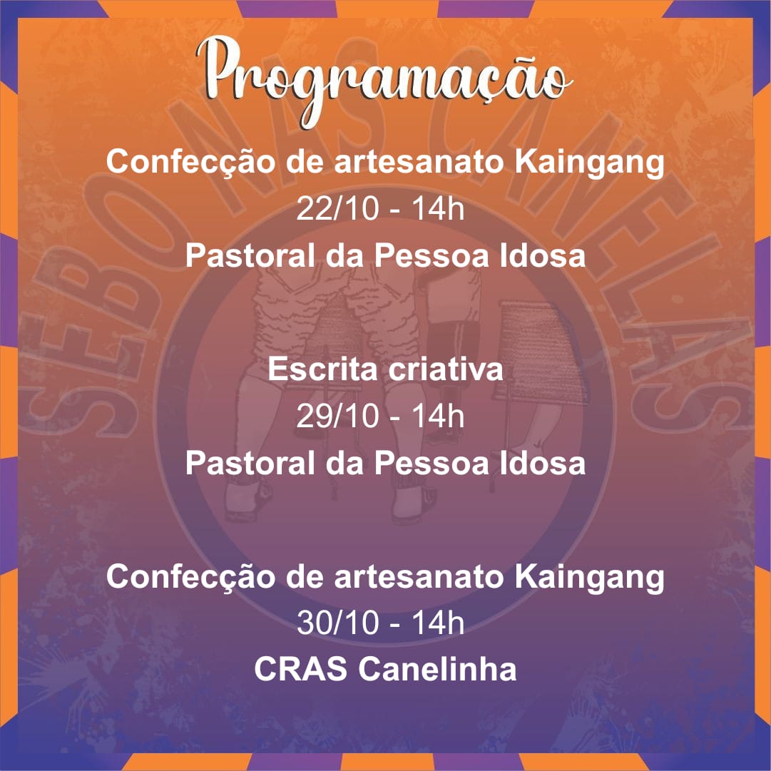Na próxima semana, o Bloco Sebo nas Canelas realiza nova oficina de artesanato kaingang, desta vez no CRAS do Canelinha. Já a Pastoral da Pessoa Idosa receberá a oficina de Escrita Criativa, ministrada por Patrícia Viale.