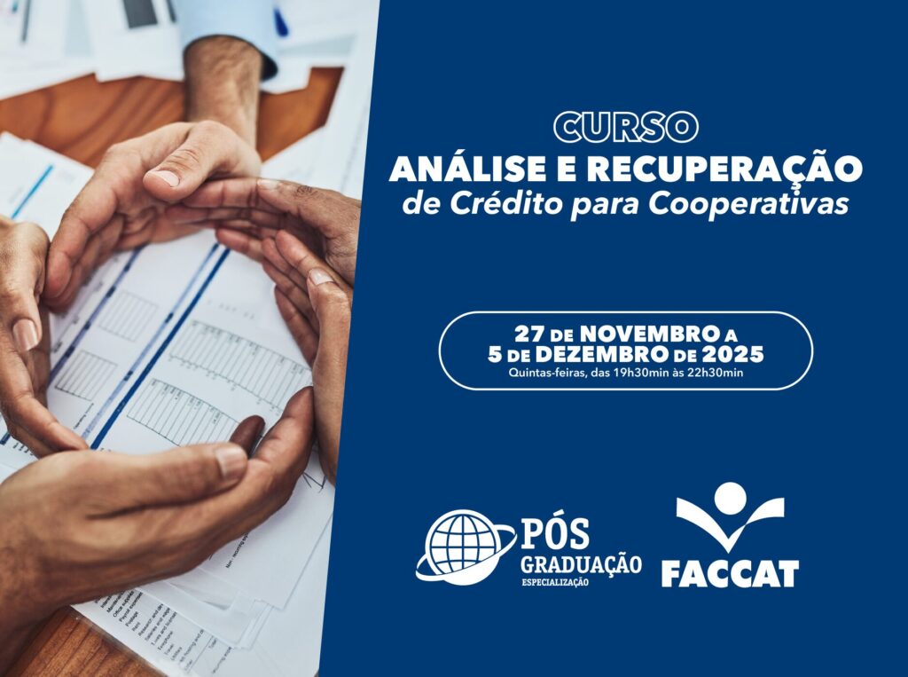 A Vice-Direção de Pós-Graduação e Pesquisa da Faccat promove, de 27 de novembro a 5 de dezembro, o curso “Análise e Recuperação de Crédito para Empresas Cooperativas”, voltado a gestores, analistas financeiros e demais profissionais que atuam em organizações cooperativas. As inscrições podem ser feitas até 21 de novembro, mediante preenchimento de formulário eletrônico em www.faccat.br/cursoseeventos.