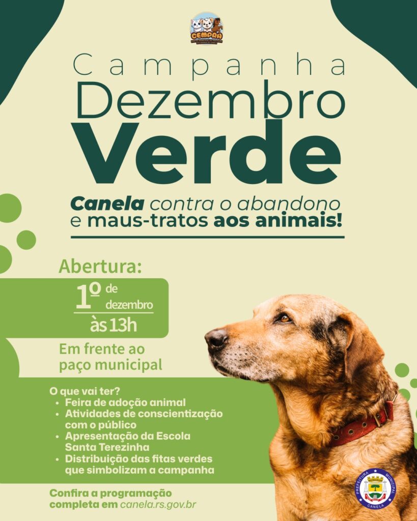 O Centro Municipal de Proteção Animal (Cempra), lança nesta segunda-feira, dia 1º, a campanha Dezembro Verde, dedicada à conscientização sobre o abandono e os maus-tratos contra os animais. A Prefeitura de Canela adere a campanha nacional e insere o tema deste mês reforçando o compromisso da administração pública com a defesa dos animais. A abertura […]