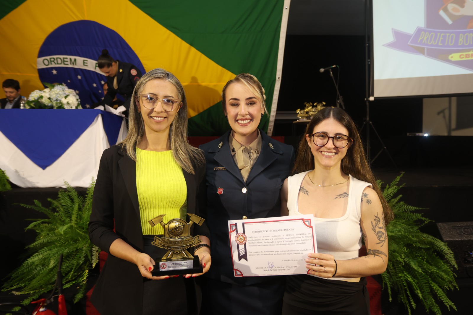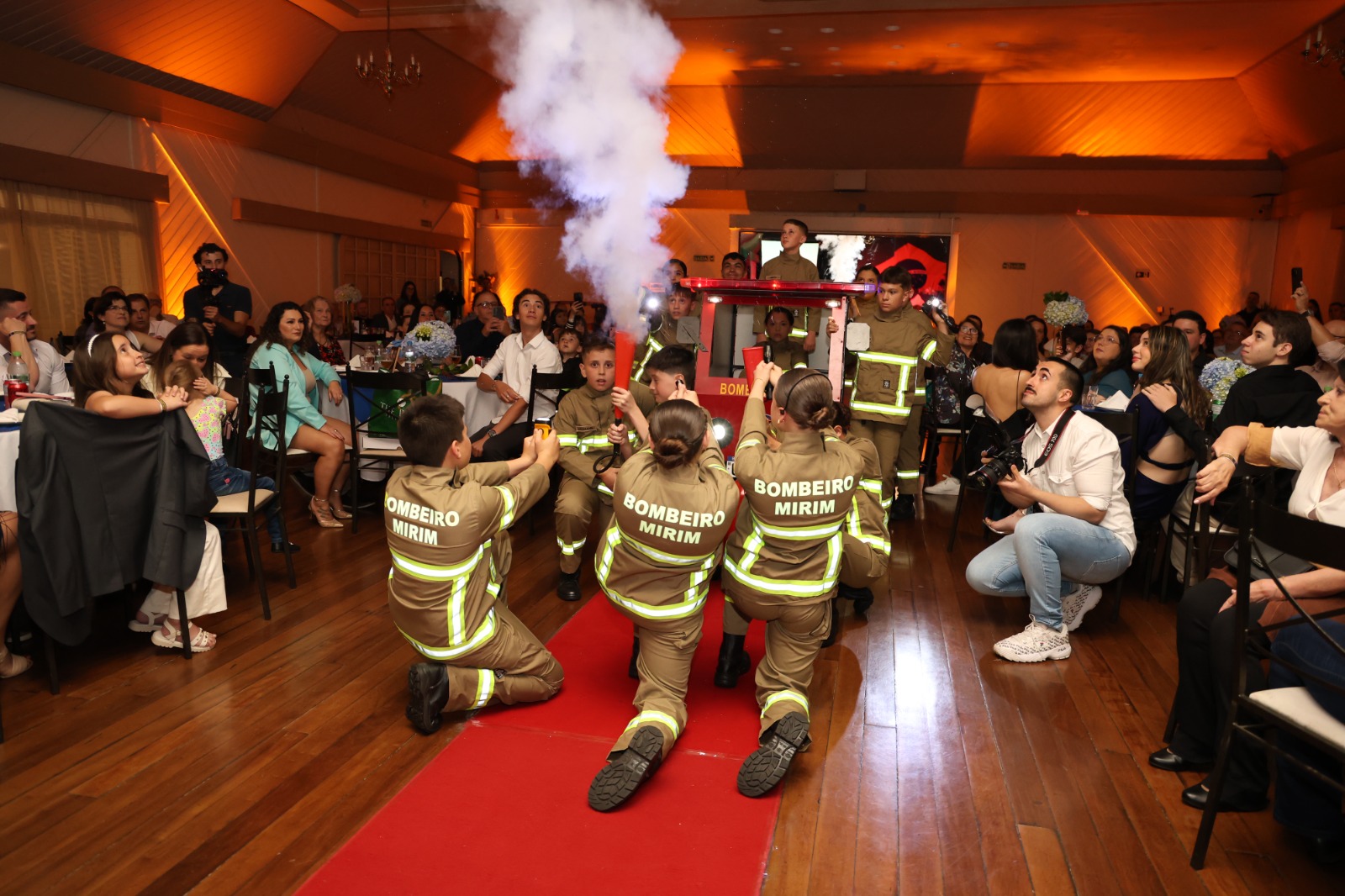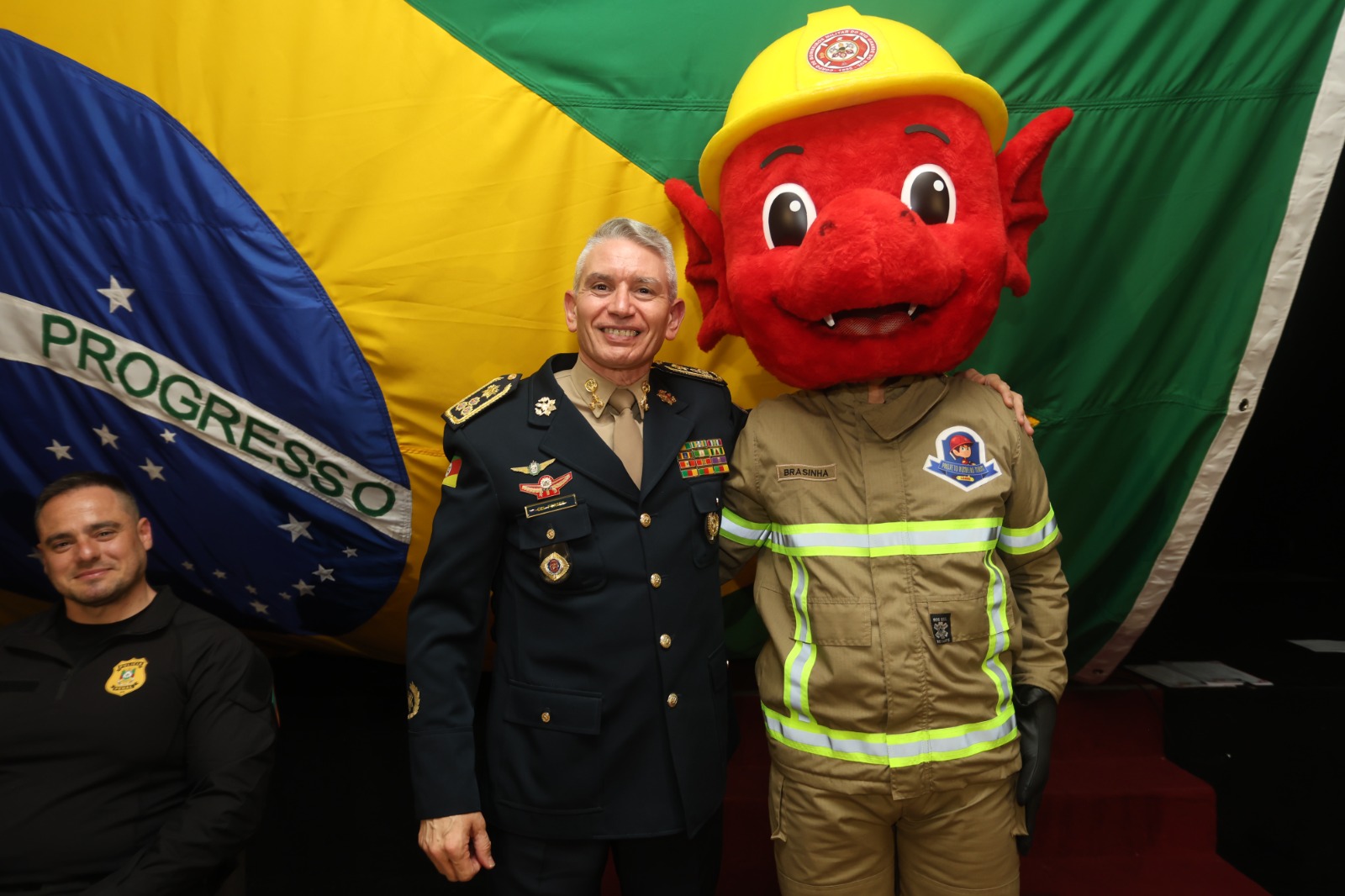 Um dos momentos mais celebrados da noite foi o lançamento oficial do Brasinha, novo mascote dos Bombeiros Mirins de Canela. Criado pela Associação do Projeto, o personagem – um pequeno dragão bombeiro equipado com o EPI oficial da corporação – representa coragem, amizade, proteção e o espírito comunitário que define o programa.