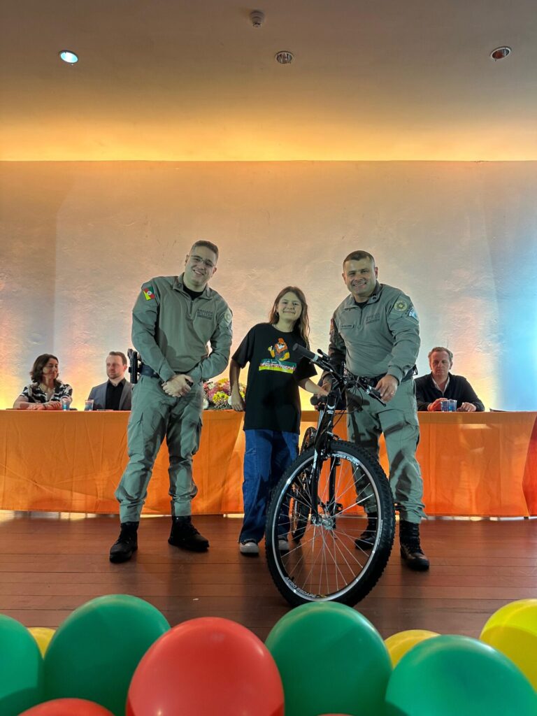 Reconhecimentos e premiações. Durante a formatura, foram entregues prêmios aos alunos que se destacaram nas redações do PROERD, representando suas escolas em um momento tradicional do programa. As autoridades presentes participaram da entrega das bicicletas e tablets aos primeiros colocados, além da premiação especial destinada aos alunos que demonstraram empenho, responsabilidade e evolução ao longo das aulas. O evento teve ainda a participação aguardada do mascote do PROERD, que animou o público e simbolizou a união das crianças com a mensagem de prevenção.