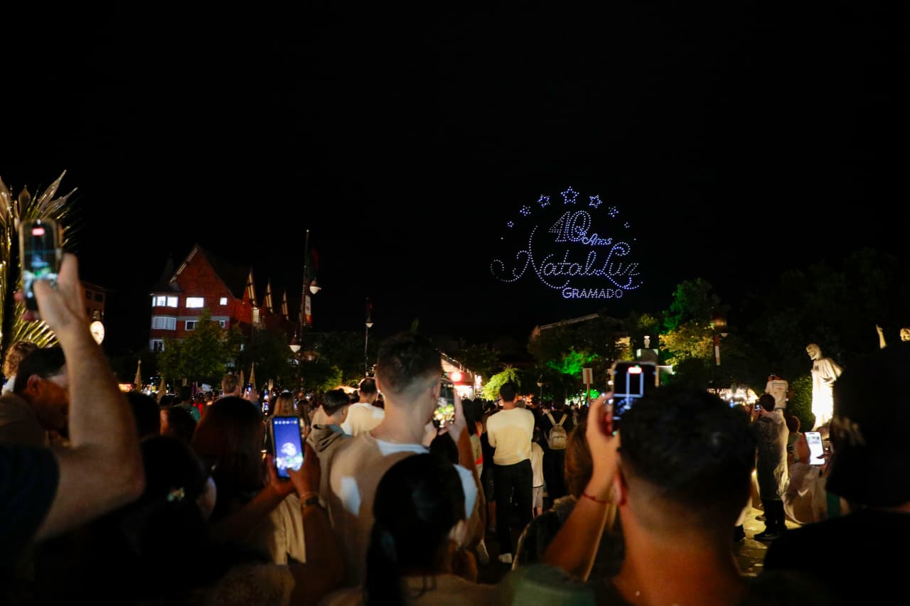 O céu de Gramado foi colorido por um tecnológico show com 1.100 drones na noite deste domingo (21). Numa parceria entre a Gramadotur, a Secretaria de Inovação e Desenvolvimento Econômico de Gramado e a empresa Droneportos do Brasil, o espetáculo inédito integrou a programação do 40° Natal Luz de Gramado, que foi reconhecido pelo Guinness World Records como o Festival de Natal Mais Longo do Mundo.