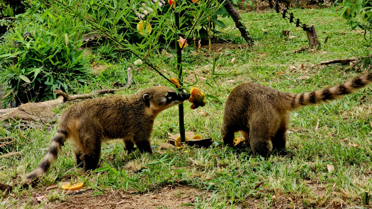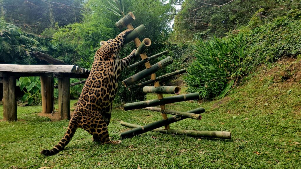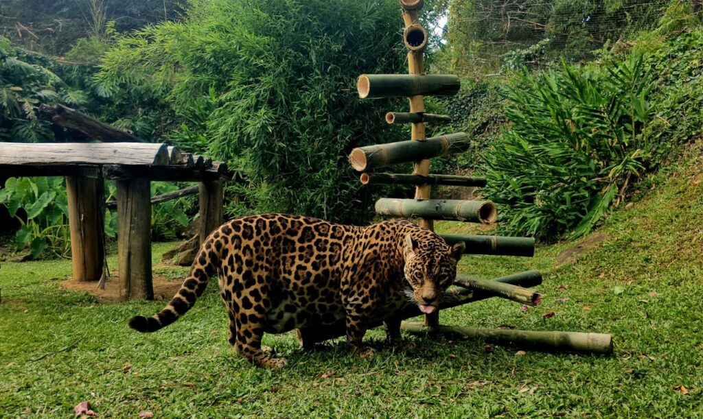 Com o auxílio do tratador Victor Zosa, a bióloga instalou pinheirinhos de Natal repletos dos petiscos preferidos de cada espécie. No recinto da onça-pintada, uma árvore articulável feita com taquaras foi recheada com iscas de carne. Para as macacas-aranha, a equipe decorou a árvore natalina com frutas e legumes. Já o pinheirinho dos quatis, estava repleto de laranjas, mangas e pepinos. “Na natureza, o gasto calórico para buscar alimento é maior. Com a atividade, nós estimulamos que os animais trabalhem os diferentes sentidos. Quanto mais tempo eles passam interagindo, melhor é o resultado”, explica Isabela.