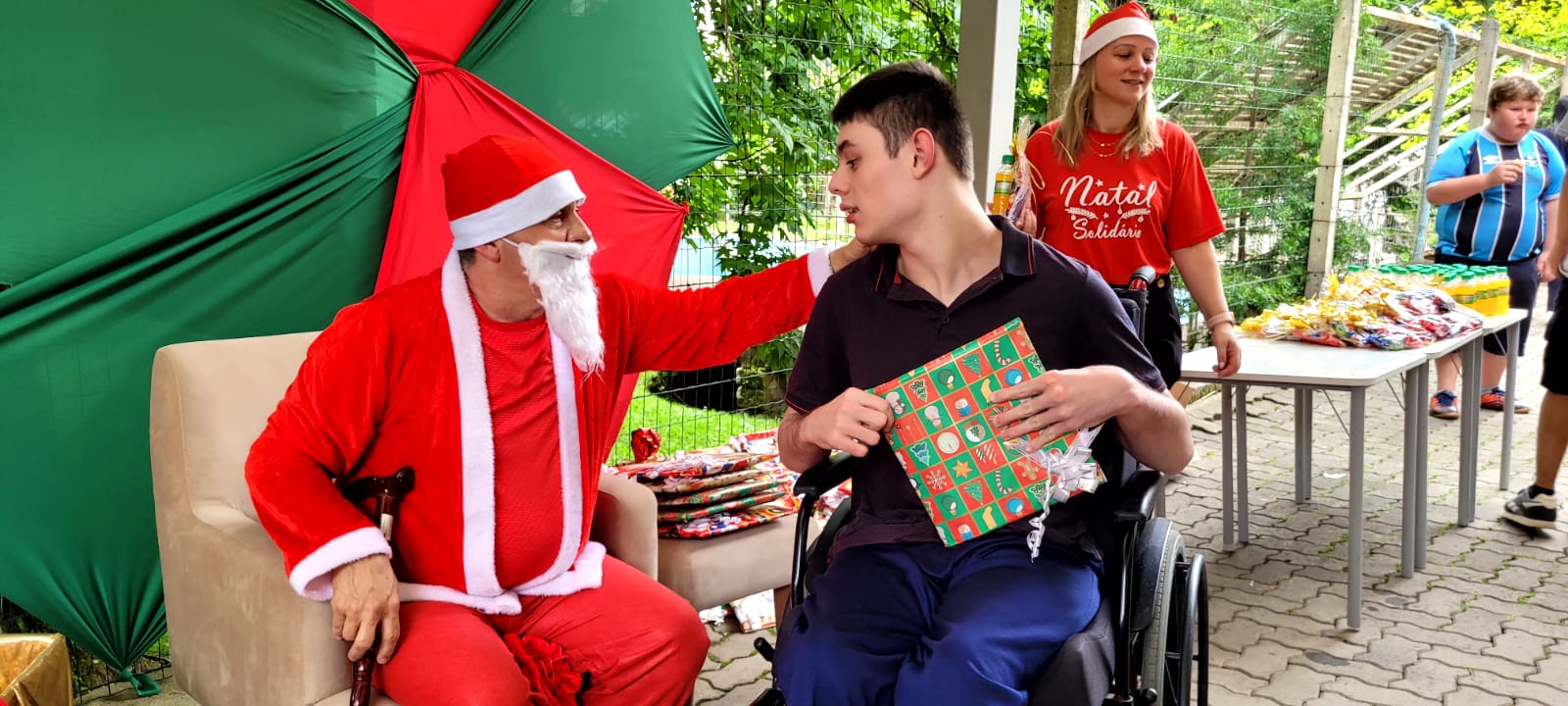 Realizado na sede da APAE, o evento proporcionou uma tarde especial para mais de 40 usuários da instituição e suas famílias, reforçando a importância da troca de afeto e do olhar atento às pessoas únicas e especiais atendidas pela associação. A programação contou com brincadeiras lúdicas, caça aos doces, lanche especial e a distribuição de sucos e refrigerantes, viabilizada pela parceria com a Fruki Bebidas.O momento mais aguardado da tarde foi a chegada do Papai Noel, que, com carinho e atenção, realizou a entrega individualizada de cerca de 80 presentes, entre brinquedos e doces, garantindo sorrisos e emoção para todos os participantes.