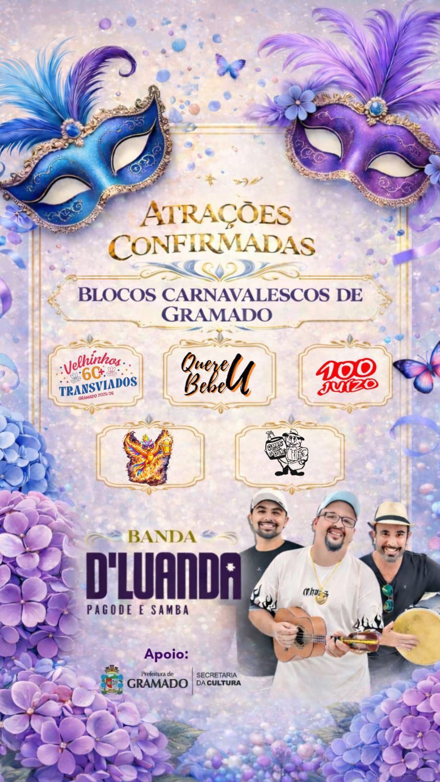 A programação conta com a apresentação dos blocos carnavalescos de Gramado, entre eles Quis um Gole, Velhinhos Transviados, Quereu Bebeu, Sem Juízo e Rebloco, valorizando o Carnaval local e a participação popular.