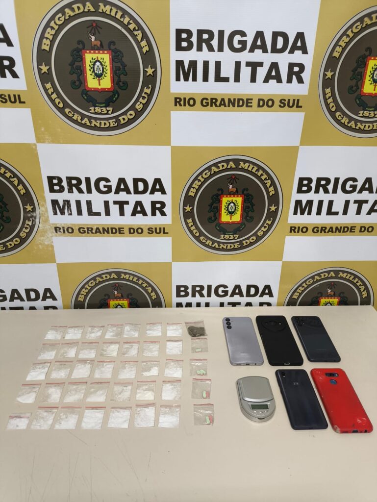 Após identificação dos dois, a guarnição visualizou no interior da bolsa tiracolo da condutora sete comprimidos de MDMA (droga sintética). No interior do automóvel foram localizadas trinta e cinco porções de cocaína e uma porção de maconha. Ainda uma balança de precisão e cinco celulares.