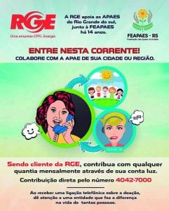 A Apae Canela está fazendo parte da Campanha da RGE “Continue esta corrente”, que arrecada doações de qualquer valor através da conta de luz. Por