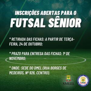 O DMEL – Departamento Municipal de Esportes e Lazer de Canela informa que estão abertas as inscrições para o Campeonato de Futsal Sênior. As equipes