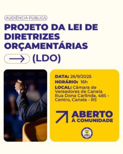 A Prefeitura de Canela convida a comunidade a participar da Audiência Pública sobre a elaboração do projeto da Lei de Diretrizes Orçamentárias (LDO) para o