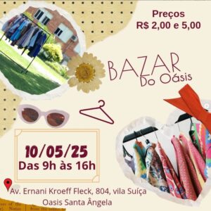 No próximo sábado, 10 de maio, o Oásis Santa Ângela promove mais uma edição do seu Bazar Solidário, das 9h às 16h. A ação tem