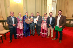 Nesta segunda-feira (25), o prefeito Nestor Tissot, o secretário de Inovação, Desenvolvimento Econômico e Relações Institucionais, Ike Koetz, e as soberanas da 31ª Festa da