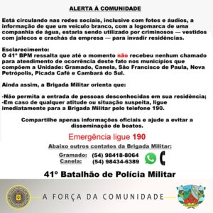 A Brigada Militar, por meio do 41º Batalhão de Polícia Militar, divulgou alerta à comunidade diante da circulação de informações nas redes sociais que apontam,