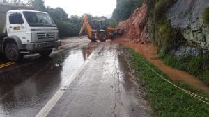 A ERS-115 segue interrompida no km 16, em Três Coroas, onde são realizados trabalhos de remoção de rochas com risco de queda na pista. No