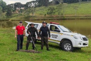 Com aproximadamente três meses de vida, o mamífero da espécie Mazama gouazoubira foi encaminhado à Instituição pela PATRAM. Também foi acolhido neste mês, jacaré de papo-amarelo ameaçado