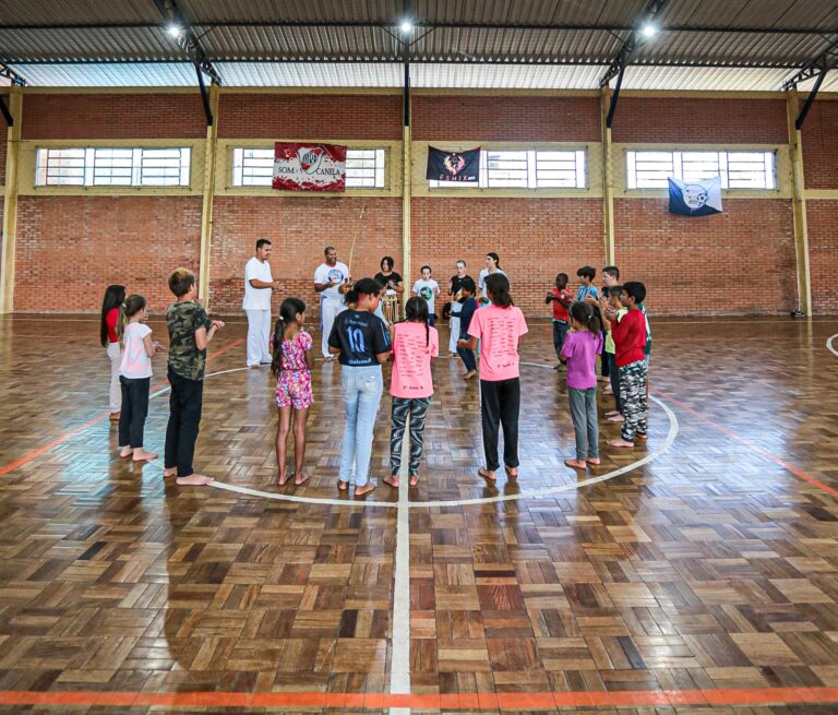 Buscando oportunizar o desenvolvimento da criatividade através da música, dança, jogos e expressão corporal, transmitidos pela capoeira, alunos da rede municipal de ensino de Canela
