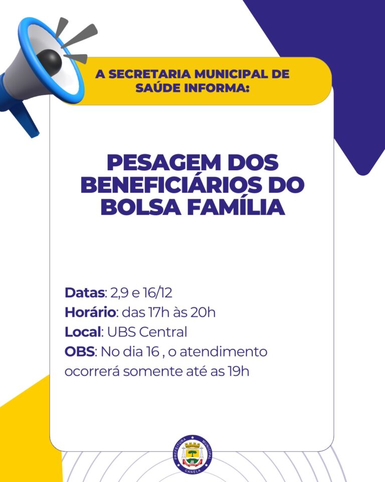 Os beneficiários do Programa Bolsa Família poderão realizar a pesagem obrigatória na Unidade Básica de Saúde (UBS) Central nos dias 2, 9 e 16 de