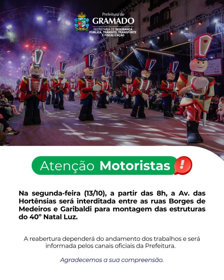 Trecho ficará bloqueado entre as ruas Borges de Medeiros e Garibaldi a partir das 8h A Prefeitura de Gramado informa que a Avenida das Hortênsias